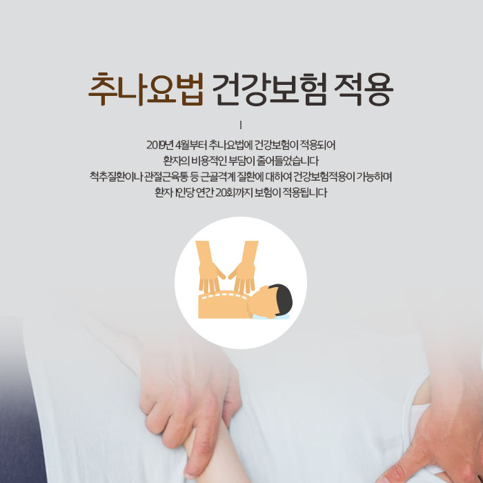 이렇게 목포한의원 추나요법을 받으며 근골격계의 구조적인 문제를 개선하고 주변 긴장과 경직을 해소해주면 통증이 줄고 기혈순환이 원활해지는 효과를 볼 수 있습니다. 추나요법은 환자에게 약물을 투여하거나 마취, 피부절개 같은 수술적인 방법을 적용하지 않고 진행하여 수술적 치료방법이 부담스러운 분들이나 기저질환으로 이미 약물을 복용중인 분, 후유증이 걱정되는 분들도 근골격계 증상이 있을 때 편하게 선택할 수 있습니다. 한편 목포한의원 추나요법은 건강보험 적용이 가능한데요. 추나의 유형에 따라서 본인부담금 50~80%만 부담하시면 치료를 받으실 수 있은 참고해 주시기 바랍니다.