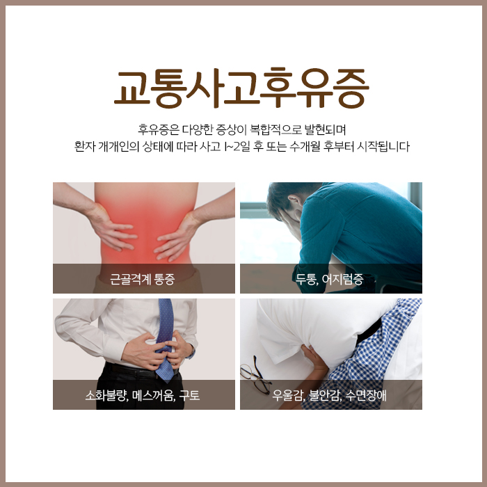 이렇게 교통사고로 인해 겉으로 보여지는 상처나 골절, 내부적으로 보여지지 않는 근골격계나 조직의 손상이 있는데 아무런 조치를 취하지 않고 방치하는 것은 위험합니다. 특히 당장 겉으로 보여지는 증상이 없다고 해서 후유증도 없다고 판단하는 것은 바람직하지 않아요. 내부적인 손상을 간과하고 평소와 다름없는 일상생활을 하다간, 손상이 점점 더 번지면서 나중에 통증과 욱신거림, 기능저하, 운동장애 등 다양한 후유증으로 이어질 수 있기 때문이에요. 그리고 교통사고후유증은 그 특성상 사고 직후부터 나타나기 보다는, 심신의 긴장이 풀리고 빠르면 하루 이틀이 지난 후부터 서서히 나타나는 경향이 있다는 것도 잊어선 안되겠습니다.