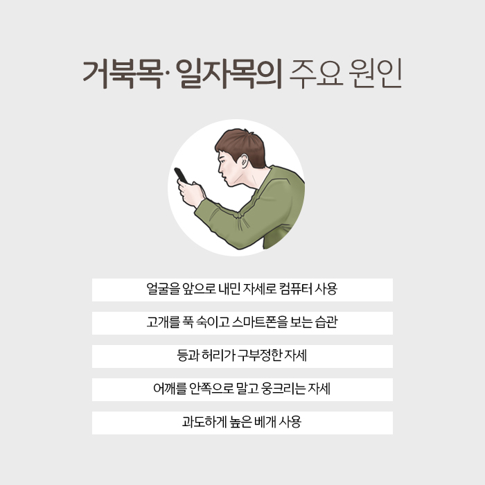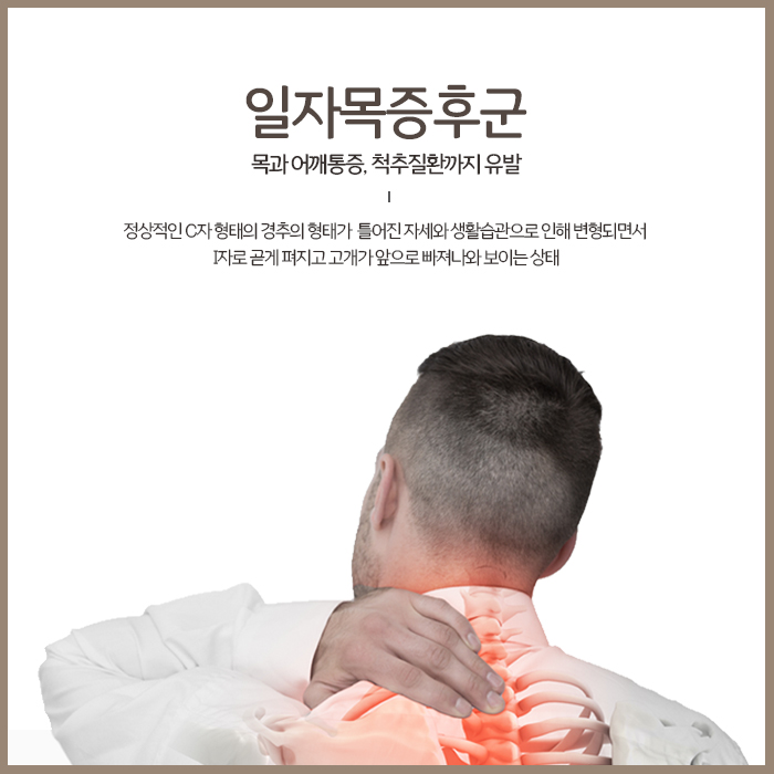 ‘바른 자세가 건강을 지키는 방법이다’라는 말을 듣고 바른 자세를 유지하려고 노력하는 분들도 많을 것입니다. 그러나 하루종일 같은 자세로 있으면서 각종 화면을 오랜시간 쳐다보다보면 본인도 모르는 사이에 등과 허리가 구부정해지고 목을 앞으로 내밀고 있거나 숙이고 있는 등 나쁜 자세를 취하게 됩니다. 정상적일 때 경추의 모양은 C자형 곡선을 그리고 있는데요. 이렇게 나쁜 자세가 습관이 되어 누적될 경우 C자형 곡선이 I자로 곧게 펴지고 역C자로 변형됩니다. 이렇게 경추의 배열이 변형된 상태를 일자목 혹은 거북목이라고 합니다.