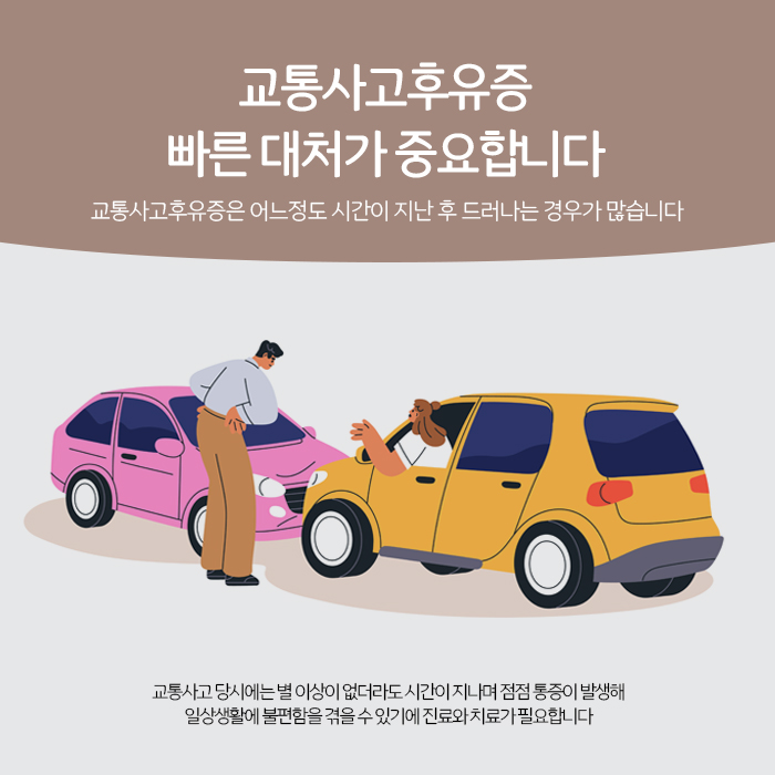 교통사고로 인한 신체적인 손상은 겉으로 보여지는 증상은 물론, 신체 내부적으로 보이지 않는 손상도 함께 일으킵니다. 예를 들면 신체 내부 장기나 신경, 근육과 인대 등 조직이 다치는 것입니다. 그래서 사고가 난 당시엔 몸이 멀쩡해 보였는데, 어느정도 시간이 지난 후부터 몸 어딘가가 욱신거리거나 통증이 느껴지는 등 교통사고후유증이 나타나기 시작하는 케이스가 생각보다 많습니다. 이렇게 발생한 후유증들은 일시적으로 나타났다가 사라지는 것이 아니라, 어느정도 시간이 지났음에도 불구하고 쉽게 해소되지 않고 때로는 더 심해지거나 만성적인 문제로 발전하기도 합니다.