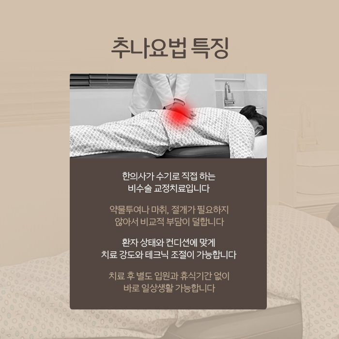 남악추나요법이란 한의사가 직접 맨손과 신체의 일부, 전용테이블만을 이용해서 문제가 생긴 척추관절 부위에 힘과 압력을 가하며 밀고 당기는 방식으로 진행하는 수기 교정치료입니다. 남악추나요법 과정을 반복하면 척추의 균형이 바로잡히고 척추관에 지나치게 가해지고 있던 압박이 해소되면서 통증과 다리저림이 개선됩니다. 또한 척추 주변 기혈순환이 원활해지면서 보행이 한결 편해집니다. 남악추나요법은 약물투여나 침습적인 과정 없이, 오로지 맨손으로만 진행하는 교정치료라는 점에서 나이가 많은 어르신, 척추수술에 부담을 느끼는 분, 이미 다른 약물을 복용중이거나 수유중인 분들도 편하게 선택할 수 있으니 참고해 주시기 바랍니다.