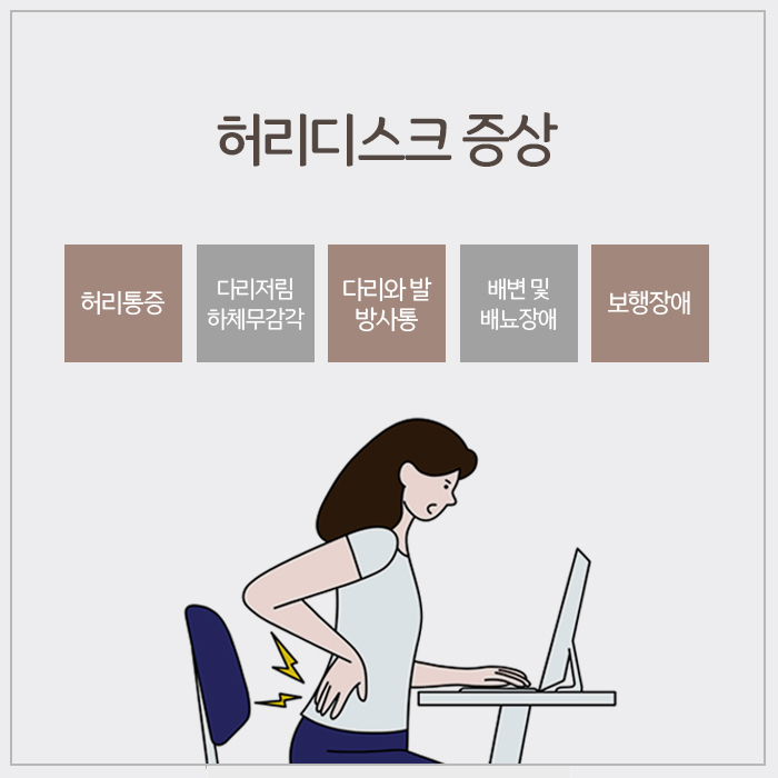 이렇게 허리디스크로 탈출한 수핵은 주변에 염증을 일으키고 척추주변을 지나는 신경과 조직을 자극합니다. 그래서 허리통증과 다리, 발까지 이어지는 방사통증을 유발하고 다리저림이나 하체가 묵직해지면서 힘이빠지는 등 신경계 문제를 일으켜요. 허리디스크로 인한 증상은 처음엔 그리 심하지 않게 느껴질 수 있어요. 하지만 초기에 대응하지 않고 방치하면 통증이 점점 강해지고 기침이나 재채기, 무거운 물건을 들거나 내리는 등 허리에 힘이 들어가는 행동시 더 심해집니다. 나중에는 가만히 있는데도 허리와 엉덩이 다리까지 통증이 유발되며 다리가 저리고 발이 당기는 증상 때문에 보행장애로 이어질 위험이 있습니다.