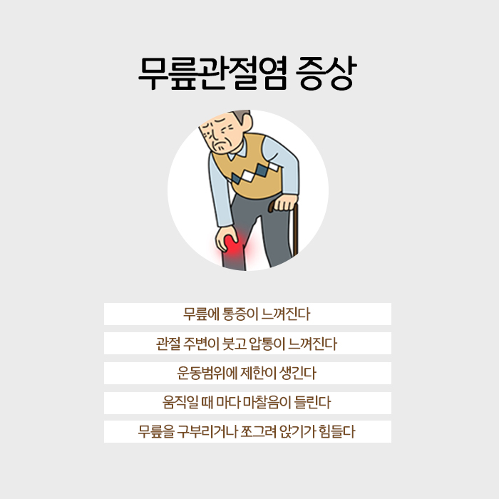 또한 오랜시간 같은 자세를 취하며 일을 하는 분이나 무거운 물건을 자주 들어 올리거나 나르는 직업을 가진 분들의 경우에도 무릎통증이 유발될 가능성이 높아요. 무릎통증을 일으키는 질환엔느 여러 가지가 있습니다. 그 중에서 노년층에게 흔하게 발생하는 것으로는 바로 ‘무릎 퇴행성관절염’입니다. 관절염은 관절을 감싸 보호하는 연골이 닳아서 그 주변에 염증이 발생해 부종과 통증이 생기는 것으로 움직임에 제한이 생기기도 합니다. 관절염은 우리 몸의 관절이 있는 부위라면 어디든 발생할 수 있는데요. 무릎은 평소 움직임이 많고 체중의 부하를 항상 받고 있는 만큼, 퇴행성관절염이 발생할 가능성이 높습니다.