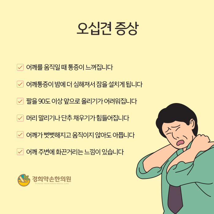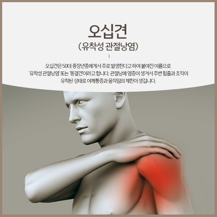 어깨통증을 일으키는 질환 중에서 대표적인 것 중 하나는 바로 ‘오십견’인데요. 오십견이란 50대 나이대, 중장년층에게서 주로 발생한다고 해서 붙여진 이름으로 유착성관절낭염 또는 동결견이라고도 불립니다. 오십견이란 어깨 관절낭에 염증이 생겨서 주변힘줄과 조직이 유착된 상태로 어깨통증이 느껴지고 팔과 어깨의 움직임에 제한이 생깁니다. 오십견 증상을 좀 더 자세히 말씀드리면, 우선 가장 대표적인 증상은 어깨통증이며 밤에 더 심해져서 잠을 설치는 분들도 있습니다. 또한 팔을 90도 이상 앞으로 올리기가 어려워지는 것은 물론, 더 심해면 머리를 말리거나 단추를 채우는 등 일상생활을 하는데 큰 불편함을 겪게 됩니다.