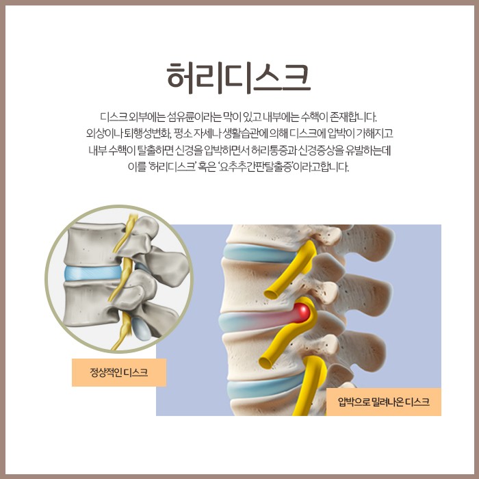 허리디스크란 척추뼈와 뼈 사이에 있는 말랑말랑한 조직의 구조물인 추간판, 즉 디스크가 다양한 원인에 의해 압박을 받고 손상되어서 내부에 있는 수핵이 바깥으로 탈출한 것을 말합니다. 이렇게 탈출한 수핵은 주변에 염증을 일으키고 신경 등 조직을 자극하여 허리통증과 다리저림, 하체 힘빠짐 등 증상을 유발합니다. 만약 허리통증이 호전과 재발을 반복하고 있고 통증이 허리에서부터 엉덩이, 종아리, 다리까지 이어지는 듯한 느낌이 든다면 허리디스크를 의심해 봐야 하며, 디스크가 더 악화되기 전에 남악한의원에 오셔서 교정치료의 도움을 받아보시기 바랍니다. 허리디스크라고 하면 무조건 수술부터 해야 한다고 생각해서 치료에 부담을 느끼는 분들이 있는데요.