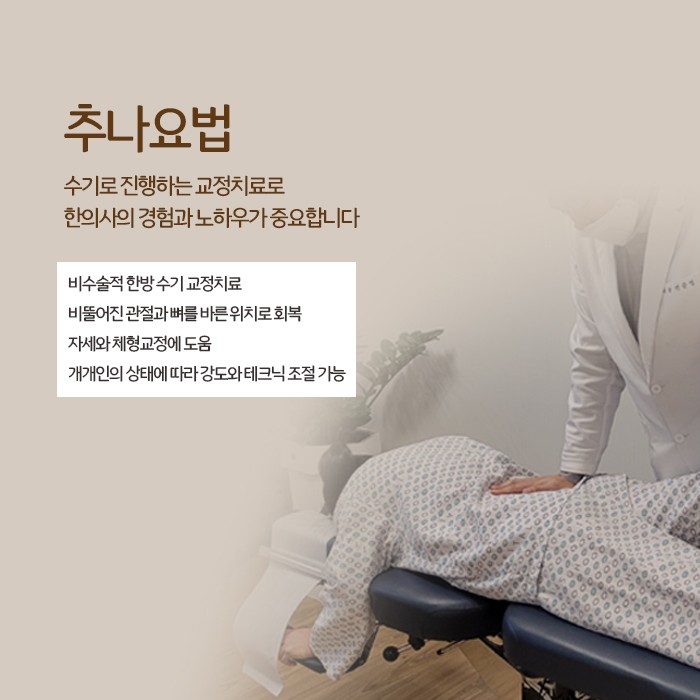 허리통증이 있을 때 남악한의원 추나요법을 받는다면 척추의 배열이 바르게 교정되고 균형이 호복되는 것은 물론, 주변 근육과 인대의 긴장이 풀어져서 허리통증이 개선됩니다. 그리고 척추 주변의 기혈순환이 원활해져서 움직임이 편해지고 디스크가 더 악화되는 것을 예방하는 데도 도움이 됩니다. 한편 남악한의원 추나요법은 건강보험 적용이 되는 수기 교정치료인데요. 이에 추나를 실시하는 유형에 따라 본인부담금의 50~80%만 내시면 치료를 받을 수 있으니 참고해 주시기 바랍니다.