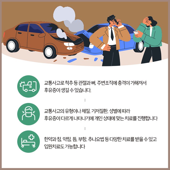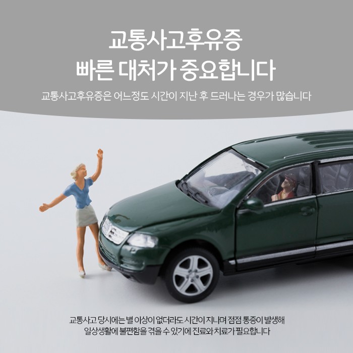 교통사고가 난 직후에 눈에 보이는 신체 출혈이나 멍 골절등 외상, 통증이 없다고 해서 후유증도 없을 것이라 판단하고 아무런 치료도 받지 않은 채 넘어가는 것은 위험해요. 미처 발견하지 못한 신체 내부적인 손상이 점점 번지면서 시간이 지나고 후유증이 발현되는 원인이 되기 때문입니다. 교통사고후유증은 주로 근골격계와 관련된 증상으로 나타나요. 사고 당시 몸이 이리저리 젖혀지고 차체에 부딪히면서 관절과 뼈의 균형이 무너지고 주변조직이 손상되기 때문인데요. 그래서 흔히 목통증과 뒷목결림, 허리통증 등을 호소하며 이는 마치 운동을 심하게 한 다음날 아침, 몸 전체가 욱신거리고 뻐근한 느낌과 비슷하다고 말씀하시는 분들도 있습니다.