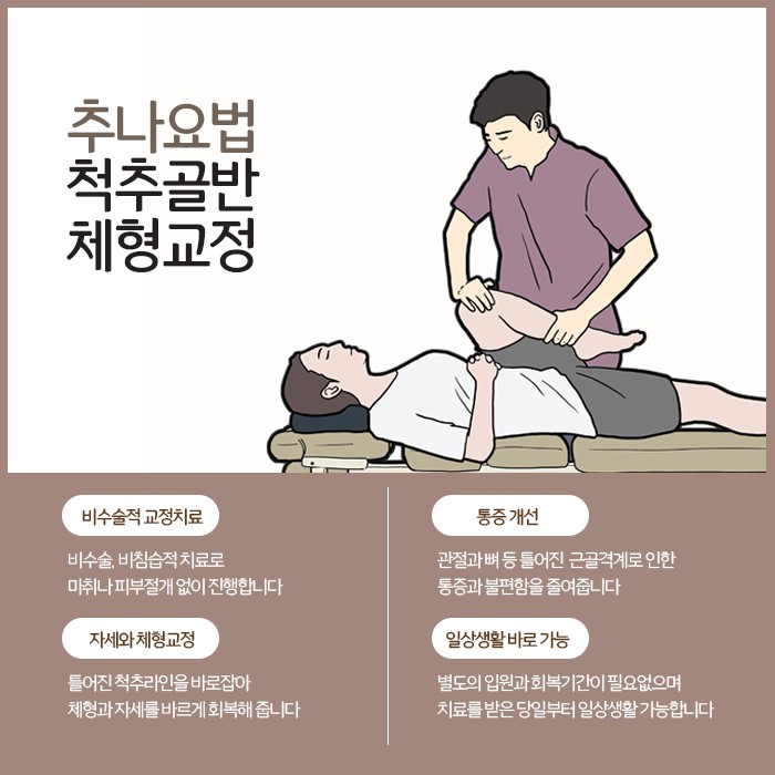 목포허리통증한의원은 허리통증을 개선하고 척추의 균형을 바로잡기 위해서 한방에서 실시하는 수기 교정치료인 추나요법을 실시합니다. 추나요법은 한의사가 직접 맨손과 신체의 일부, 전용테이블만을 이용해서 실시하는 수기 교정치료인데요. 추나요법을 받으면 틀어진 척추의 위치를 바르게 교정하고 주변 근육과 인대의 긴장을 풀어줘서 통증개선과 기능회복에 도움이 됩니다. 또한 기혈순환이 원활해져서 조직을 강화하고 척추를 지지하는 힘과 안정성을 높입니다. 목포허리통증한의원은 추나요법과 함께 침과 약침, 뜸, 부항, 한약 등 한방치료를 병행해서 통증과 염증 개선에 도움을 드리오니 참고해 주시기 바랍니다.