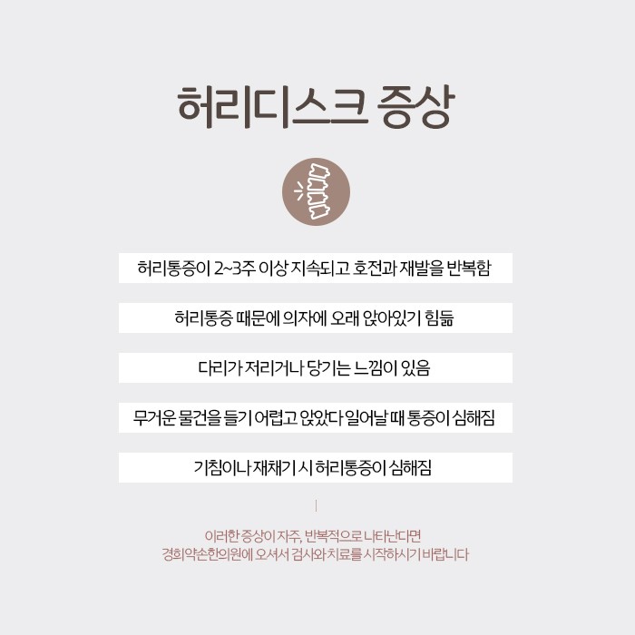 허리통증이 생긴 원인은 많은 경우 급성으로 생긴 근육통일 가능성이 높습니다. 근육통이나 염좌로 생긴 허리통증일 경우, 며칠 움직임을 최소화 하면서 휴식을 취하면 나아지는 편입니다. 혹은 파스를 붙이거나 찜질을 하고 진통제를 복용하면 대부분 나아지곤 해요. 하지만 허리통증이 평소 비뚤어진 자세나 생활습관이 쌓여서 생긴 척추질환 때문이라면 상황을 다르게 봐야 합니다. 허리디스크나 척추관협착증 같은 척추질환이 원인이 되어 나타난 허리통증인데 이를 오래 방치할 경우, 만성이 될 수도 있고 척추 주변부로 통증이 번져서 더 심각한 근골격계 질환으로 이어질 수도 있기 때문입니다.