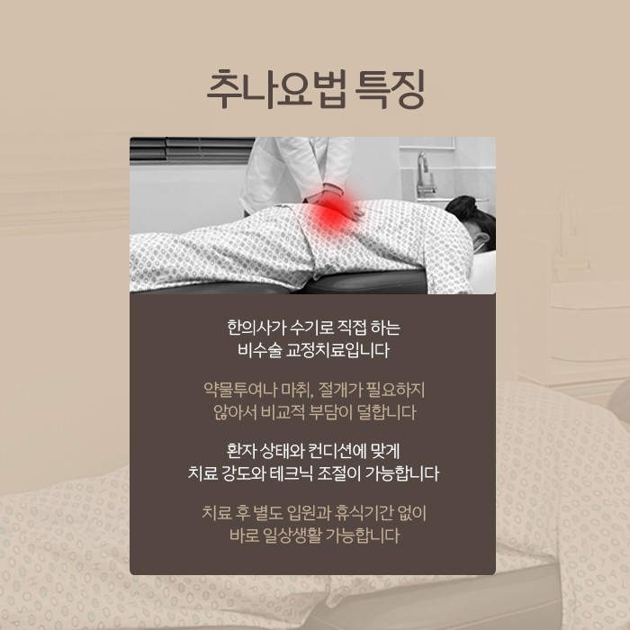 저희 목포경희약손한의원은 틀어진 골반을 바로잡고 통증과 기능을 개선하기 위해서 한방에서 실시하는 수기 교정치료인 남악추나요법을 실시하고 있습니다. 남악추나요법은 관련된 교육을 이수한 한의사만이 실시할 수 있는 수기 교정치료인데요. 한의사가 직접 맨손과 전용테이블만을 이용해서 비뚤어진 골반과 주변근육, 인대를 밀거나 잡아당기면서 원래 균형상태를 회복해주는 것이라고 보시면 됩니다. 남악추나요법은 환자에게 약물을 투여하거나 마취, 피부절개등 침습적인 치료를 적용하지 않고 오로지 수기로만 하여 부작용이나 후유증에 대한 걱정을 덜고 편하게 선택해서 받을 수 있어요.