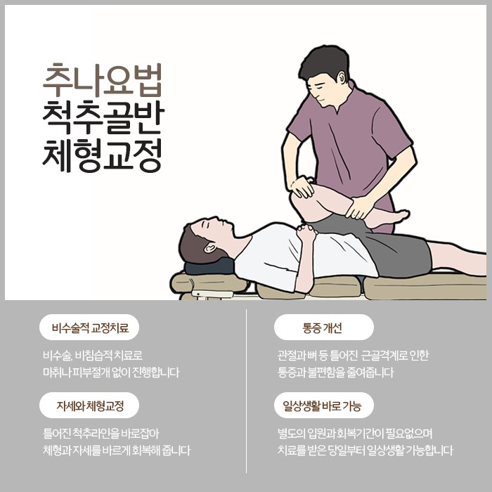 추나치료를 받으면 틀어져 있던 경추의 배열이 바로잡히고 주변 근육과 인대가 받던 긴장과 압박이 해소되면서 통증과 기능이 회복됩니다. 또한 기혈순환이 원활해져서 목의 움직임이 한결 편해지는 효과를 기대할 수 있겠습니다. 저희 목포경희약손한의원은 영암 삼호추나치료은 물론이고 환자의 상태와 체질에 맞게 침과 약침, 뜸, 부항, 한약 등 한방치료를 적절하게 병행해서 경추의 배열을 바르게 하고 통증과 기능개선에 도움을 드립니다. 한편 추나요법은 건강보험이 적용되는데요. 추나의 유형인 단순, 복잡, 특수에 따라서 달라지며, 본인부담금의 50~80%만 내시면 받을 수 있으니 비용적인 부담을 덜 수 있습니다.