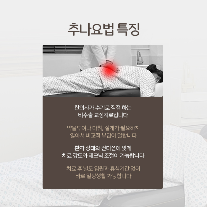 추나요법은 한의사가 직접 맨손과 전용테이블, 신체의일부만을 이용해 틀어지고 균형이 무너진 근골격계 부위를 밀거나 잡아당기며 유효한 압박을 가하고 원래의 상태를 회복해주는 것을 말합니다. 척추관협착증으로 허리통증이 있는 환자가 추나요법을 받는다면 척추에 가해지고 있던 부담이 줄고 척추관의 압박이 개선되면서 통증이 줄고 보행이 한결 편해지는 효과를 기대할 수 있습니다. 이는 구부정했던 허리와 자세를 바르게 해 주기 때문에 만족도를 높일 수 있을 것입니다. 목포한의원은 추나요법과 함께 환자의 상태에 따라 침과 약침, 뜸, 부항, 한약 등 한방치료를 병행하고 있으니 참고해 주시기 바랍니다.