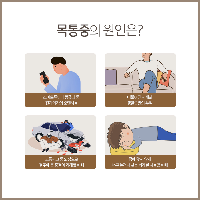 이렇게 목뼈의 배열이 I자로 펴진 것을 일자목, 역C자로 변형된 것을 거북목이라고 합니다. 거북목 체형이 되면 얼굴이 앞으로 쭉 빠져나오고 등이 구부정해 보이는데 이 때문에 외적으로 스트레스를 받을 수 있습니다. 거북목이 되면 정상적인 경추 구조일 때에 비해 무거운 머리 무게를 제대로 지탱하기가 힘들고 주변 근육과 인대가 긴장하고 뻣뻣해지면서 작은 충격에도 통증과 욱신거리는 증상이 발생하게 됩니다. 조금만 무리해도 피로감이 심하게 오기도 하고요. 만약 남악한방병원 진료나 치료를 받지 않은 채 목통증을 방치할 경우 경추가 주변에서 가하는 충격과 압박을 버티지 못하면서 경추 뼈와 뼈 사이에 있는 디스크가 터지는 목디스크로 이어질 위험이 높아집니다.
