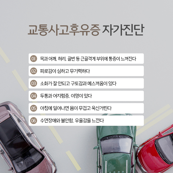 교통사고후유증은 주로 근골격계 증상으로 나타납니다.