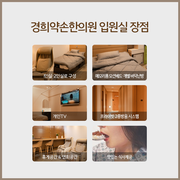 한편 목포입원한의원은 통원치료가 어려운 상황이거나 집중적인 치료가 필요한 환자분들을 위해 입원실을 마련중입니다. 입원치료를 하시면 심신의 안정을 취하며 치료받을 수 있으며, 몸 상태에 따라 집중적인 치료가 가능하여 일상으로의 빠른 회복에 도움이 됩니다.