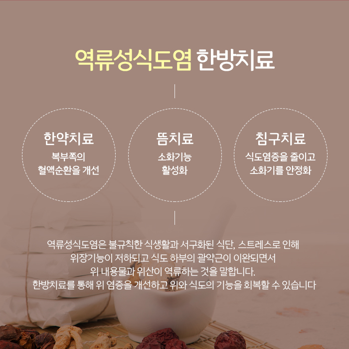 역류성식도염 한방치료는 주로 한약과 침, 약침으로 진행하는데요. 가장 먼저 한약은 환자 개개인의 체질과 증상에 따라 개별적으로 처방해 드려요. 한약을 복용하면 체내 어혈과 노폐물을 빠르게 배출하여 기혈순환을 원활하게 하고 염증을 줄여서 위장 기능을 보강하고 점막의 치유를 촉진합니다. 또한 영양소를 공급하고 면역력을 높여 증상이 재바하거나 악화되는 것을 예방합니다.