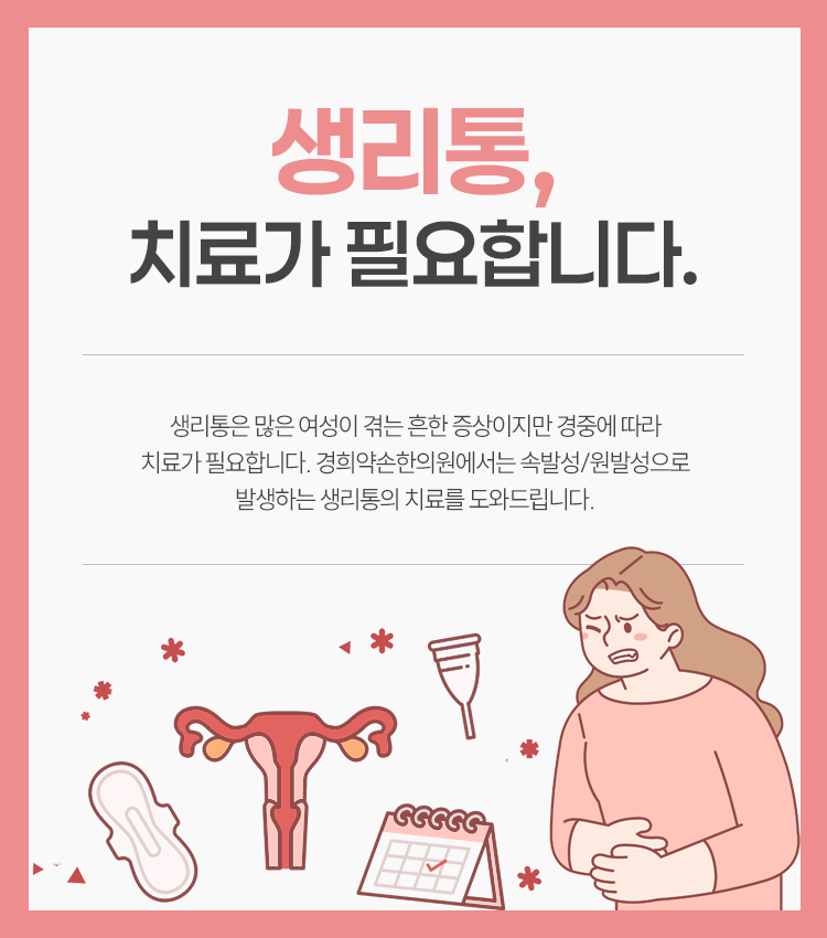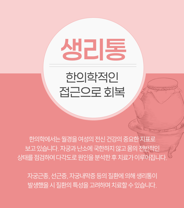 발생하게 되는 문제의 원인이 다양한 만큼, 치료도 일괄적으로 진행되지 않고 한 사람, 한 사람의 상태를 따진 후에 이루어지고 있습니다. 생리통 문제가 발생하며 건강한 생활에 방해를 받고 있었던 상황이라면 늦지 않게 도움을 받아 보시기를 바라도록 하겠습니다. 며칠만 참으면 되는 일이라고 가볍게 생각하실 수 있겠으나 그것이 심한 스트레스를 유발하여 아픔을 더 키울 수 있고, 때로는 다양한 질환과 직접적으로 연관되어 있을 가능성도 존재합니다. 이런 지점들을 고려하시면서 관리에 들어가 주실 것을 권유드리도록 하겠습니다. 감사합니다.