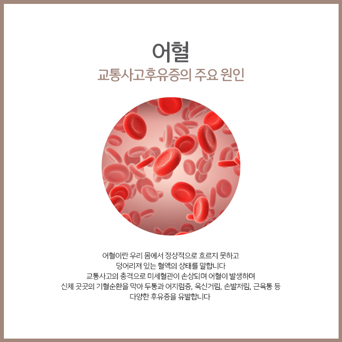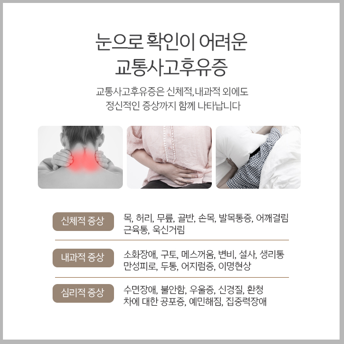몸 상태를 체크하고 후유증에 대비하기 보다는 빨리 사고현장을 정리하고 평소와 다름없는 일상생활을 이어가는 것인데요. 이렇게 교통사고 이후 후유증에 대비하고 치료하는 것에 소홀할 경우, 어느정도 시간이 지나고 나서 갑자기 발현되는 후유증에 고통받을 수 있어요. 가장 많이들 호소하는 후유증은 허리통증과 목통증, 뒷목뻐근함, 어깨통증 같은 근골격계 증상이고 이 외에도 소화불량과 구토, 메스꺼움, 두통, 어지럼증, 만성피로감, 손발저림, 수면장애 등 여러 증상이 동시다발적으로 나타나기도 합니다.