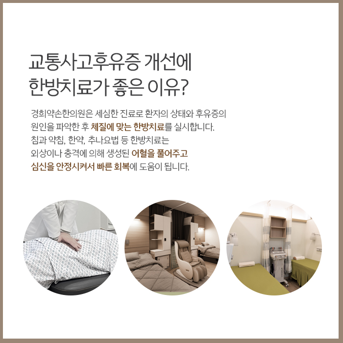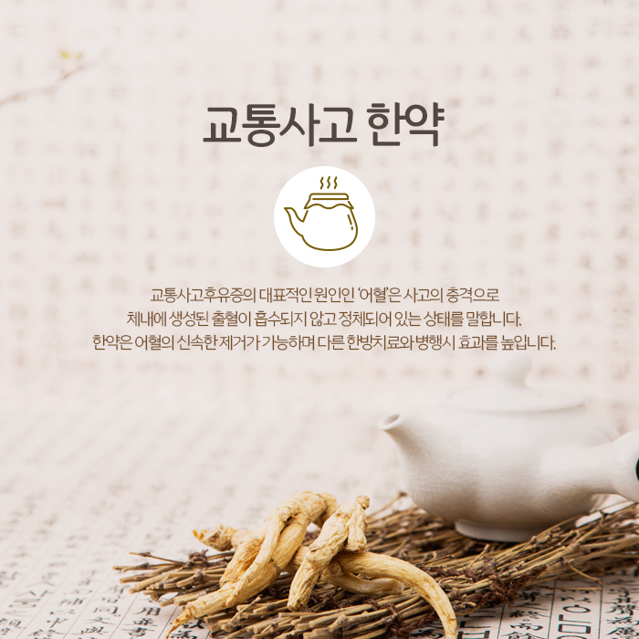 한방치료는 신체의 손상된 조직을 재생시키고 어혈배출로 기혈순환을 원활하게 하는 데 목표를 두고 있으며 침과 약침, 뜸, 부항, 추나요법, 한약 등을 실시합니다. 교통사고가 난 초기엔 주로 한약을 처방해 복용하도록 하는데요. 한약은 어혈과 노폐물을 빠르게 배출하여 기혈순환을 원활하게 하고 손상된 근육과 인대, 신경 등 신체 깊숙한 곳의 조직이 재생되도록 합니다.