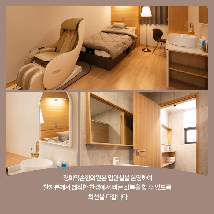 교통사고 이후에는 내가 당장 느끼는 증상이나 불편함, 보여지는 상처만을 치료하면 된다고 생각할 수 있어요. 하지만 영상검사를 받아보아도 원인을 찾기 힘든 통증이 이어지고 있고 후유증이 만성화되어가고 있다면 반드시 내원하셔서 내 몸상태와 체질에 맞는 한방치료를 받아보시길 바랍니다. 한편 교통사고 후 몸 상태에 따라 통원이 힘들거나 집중적인 치료가 필요한 환자가 있을 수 있는데요. 남악입원실한의원은 이런 경우 입원치료를 권해드립니다. 저희 한의원은 1~2실로 된 입원실을 마련해 놓고 있으며, 입원치료시 환자분께서는 쾌적한 환경에서 심신을 안정시키며 건강회복에만 집중할 수 있답니다.