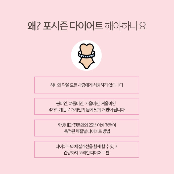 포시즌 다이어트란 사람의 체질을 봄, 여름, 가을, 겨울 이렇게 4계절로 나누고 체질에 맞게 다이어트 한약 환을 처방해 드리는 것입니다. 다이어트라고 해서 누구에게나 다 똑같고 일괄적인 목포다이어트 처방을 해서는 만족스런 효과를 기대하기 힘듭니다. 누군가에게는 효과가 있을지 몰라도 누군가에겐 아무런 효과가 없거나 오히려 건강을 해칠 수 있기 때문입니다. 포시즌 다이어트는 체중감량 처방에 대한 오랜 경험을 갖고 있는 원장님께서 직접 진료를 실시하여 살이 찐 원인과 체질을 파악한 후 이를 반영하여 개개인에게 가장 적합한 한방치료를 처방해 드립니다. 그래서 요요현상에 대한 걱정을 줄이고 건강한 목포다이어트를 하는데 도움이 됩니다.