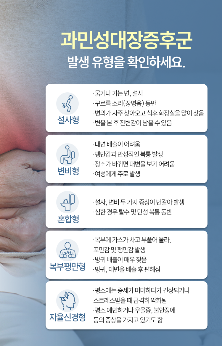 과민성대장증후군은 겪고 계신 상황에 따라 설사형과 변비형, 혼합형으로 구분짓고 있습니다. 변의 상태가 무르다면 설사형, 변을 보기 어렵고 변의 상태가 딱딱하다면 변비형이라고 생각해 주시면 되겠습니다. 그리고 설사와 변비가 번갈아 나타나는 것을 혼합형이라 말합니다. 이외에도 가스가 자주 차는 것을 복부팽만형, 평상시에는 증상이 눈에 띄지 않다가 스트레스를 받는 순간 갑작스럽게 증상이 발생, 악화되는 것을 자율신경형이라 말하기도 합니다.