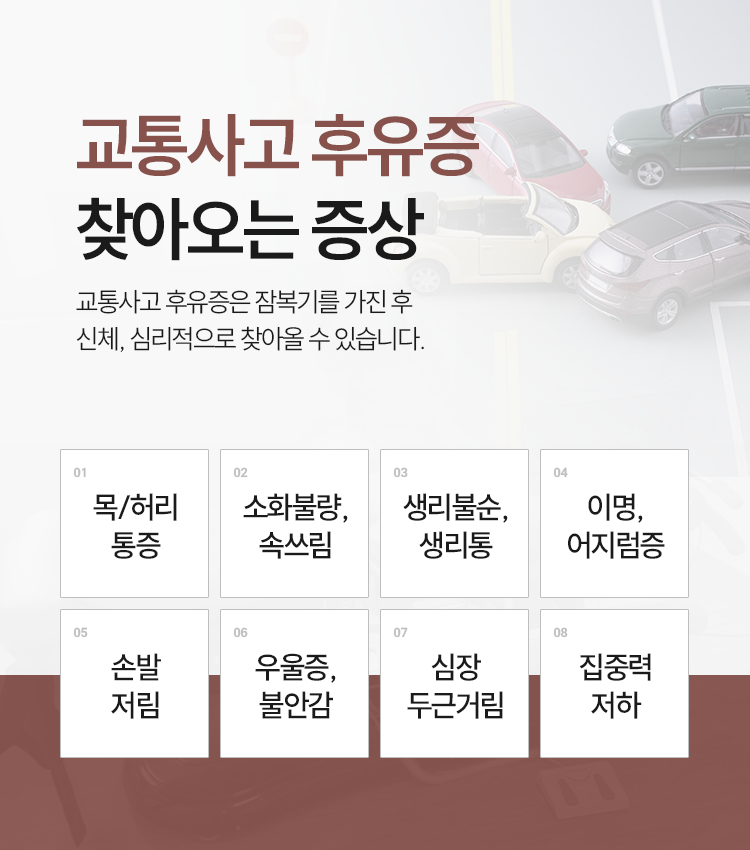 조직의 기능을 정상화해 준다면 통증이나 뻐근함, 가동 범위 제한 등의 문제를 개선하실 수 있습니다. 한약 처방은 어혈로 인해 막혀서 정상적인 순환을 하지 못하고 있던 혈액이 다시금 원만하게 흐를 수 있도록 해 주면서 내부 상태를 정상화하는 데 일조하고 있습니다. 이밖에도 약침요법으로 특정 부위 염증과 통증 경감에 도움을 드리기도 하는 등, 어떤 문제가 찾아왔느냐에 따라서 다른 치료를 진행하면서 몸 건강 회복에 일조하고 있습니다. 사고를 겪고 후유증이 걱정된다면 내원 후 상태부터 살펴 보시기를 바랍니다.