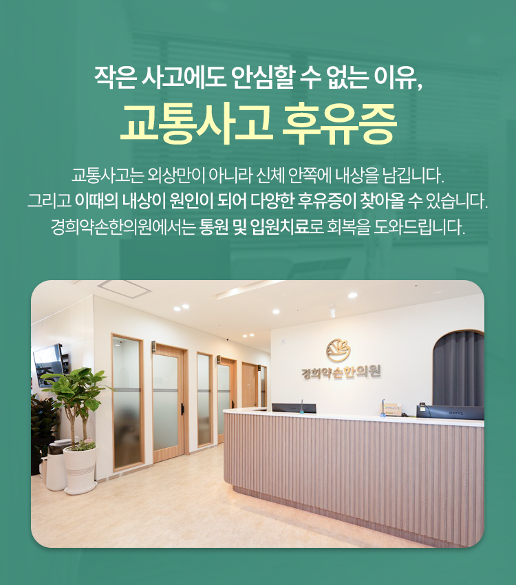 사고를 겪은 당일에는 아무렇지 않았지만 시간이 흐를수록 목도 아프고, 일에 집중하기도 힘들고, 기억력도 떨어지는 등 크고 작은 변화가 생길 수 있습니다. 이러한 증상이 찾아오게 되는 이유 자체가 교통사고 후유증일 수 있기 때문에 증상의 경중을 하나하나 따지기보다는 이상이 있다는 생각이 든다면 적극적으로 상태를 살피면서 치료, 회복을 위해 노력해 주시기를 바라겠습니다. 본원에서도 환자분의 전반적인 몸 건강 상태와 현재 겪고 있는 증상 등을 고려하여 다양한 치료로 회복에 이바지하겠습니다.