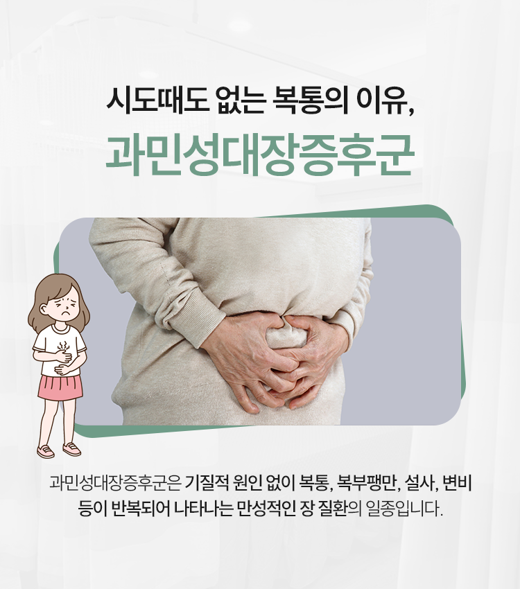 두 번째는 변비형입니다. 이는 강한 복통과 더불어 변비가 주된 증상으로 나타나는데요. 배변 횟수가 줄어들고 변이 딱딱해서 배변 시 과도하게 힘을 주어야 하는 일이 많이 있습니다. 세 번째는 혼합형입니다. 이것은 설사형과 변비형 증상이 주기적 또는 비주기적으로 번갈아 나타난다는 게 특징입니다.