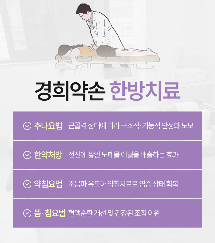 근육이나 골격에 이상이 발생한 경우 틀어진 골격을 당기고 미는 방식으로 교정하는 추나요법을 통해 신체의 균형을 회복하고 근육의 긴장을 완화하는 데 도움을 드리고 있습니다. 이러한 추나요법은 비정상적으로 배열된 척추나 관절을 바로잡아 신경 압박을 줄이고 주변 근육의 기능을 정상화하는 데 기여합니다. 이처럼 다양한 한방 관리 방법을 통해 이상이 발생한 부위를 보살피고 이전의 건강한 상태로 회복할 수 있도록 지속적인 노력을 기울이고 있습니다.