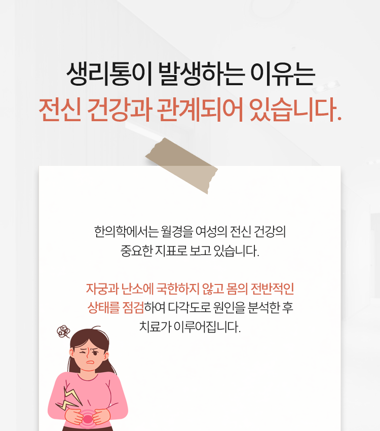 특히 한약 처방은 개인의 체질 및 전반적인 몸 상태를 고려하여 진행이 되고 있습니다. 그렇기에 더욱 안정적인 회복을 도모할 수 있는 방안이라고 생각해 주시면 되겠는데요. 생리통의 유발 원인 자체를 고려하고 접근하여 이에 대한 조절을 도와드리고 있기 때문에 자연스럽게 통증을 가라앉히고 예방 효과를 기대할 수 있습니다.