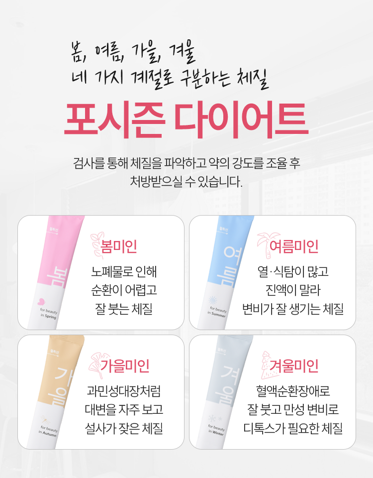 사람들은 저마다 다른 체질을 지니고 있습니다. 이런 체질에 대한 이해를 조금도 하지 못한 채로 다이어트를 진행하게 된다면 어떤 경우에는 오히려 밑 빠진 독에 물 붓는 것과 다를 바 없는 상황이 되기도 합니다. 그러나 체질의 경우 혼자서는 파악이 어려울 수밖에 없는데요. 때문에 남악다이어트 한의원으로 내원을 하셔서 이에 대한 도움을 받아 보시는 게 현명할 수 있습니다. 본원에서는 개인의 체질을 계절에 빗대어 표현하고 있으며 각 체질을 상세히 분석해 나간 뒤 그에 대한 처방을 도와드리고 있습니다.