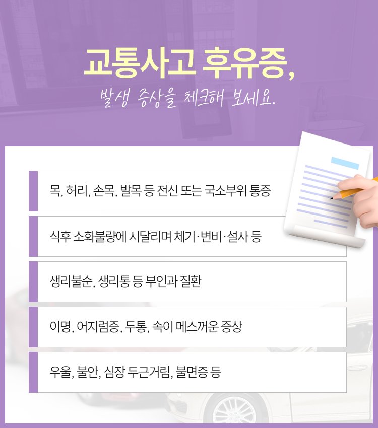 교통사고 후유증이 많은 분들에게 고민을 안기는 존재가 될 수밖에 없습니다. 후유증이 남기는 손상은 짧은 시일 내 사그라드는 게 아니라 오히려 만성화가 되어 생각보다 더 긴 시간 동안 장기화되는 일도 쉽게 벌어지고는 합니다. 그런 상황인 만큼 건강하게 상태를 회복하고자 하는 마음을 가지면서 내부를 돌보는 데 집중해 보실 것을 권유드리고 싶습니다. 본원에서도 겪고 계신 상황에 집중하면서 한 분, 한 분의 건강한 삶을 찾아드리는 데까지 도움을 전하도록 하겠습니다. 감사합니다.
