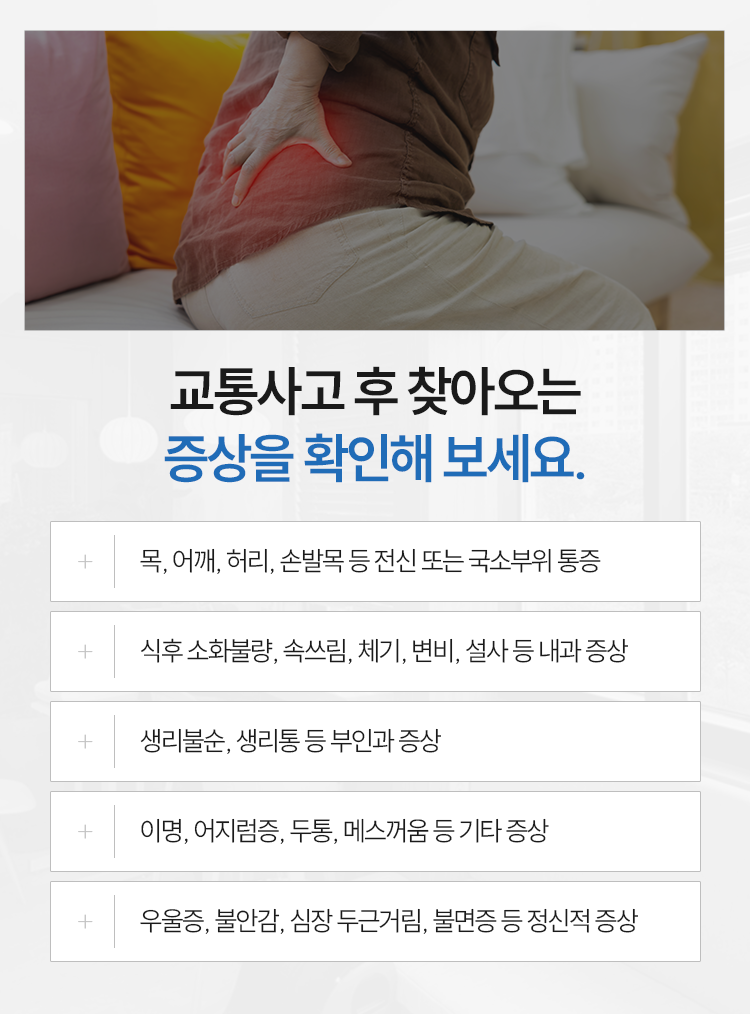 특히 충돌이 발생하는 찰나의 순간에 우리 신체는 평소 겪어보지 못한 강한 충격을 고스란히 흡수하게 되며 이 과정에서 다양한 형태의 신체적 후유증이 남을 수 있습니다. 사고 직후에는 당혹감으로 인해 별다른 통증을 느끼지 못할 수도 있겠으나 시간이 흐르면서 목과 어깨가 뻐근해지거나 허리 주변으로 묵직한 통증이 번져 나가는 경험을 할 수 있다고 말씀을 드렸습니다.