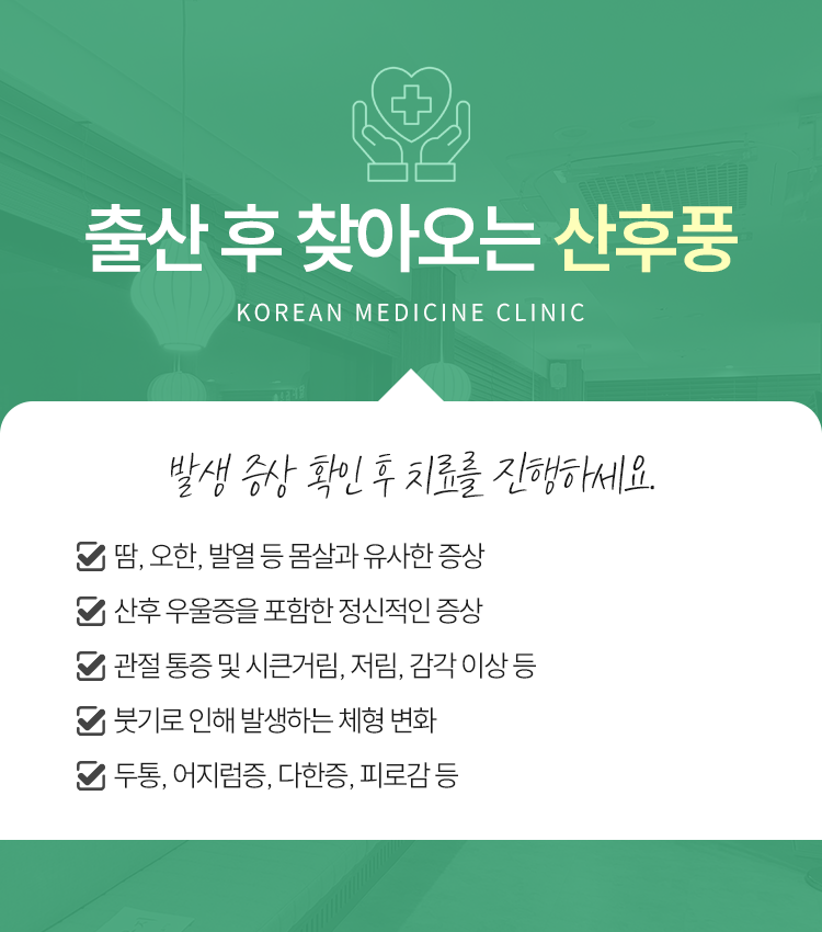산후풍이 찾아오면 관절이 쑤시는 것만이 아닌 전신에서 다양한 이상 증후를 느끼게 될 수 있습니다.