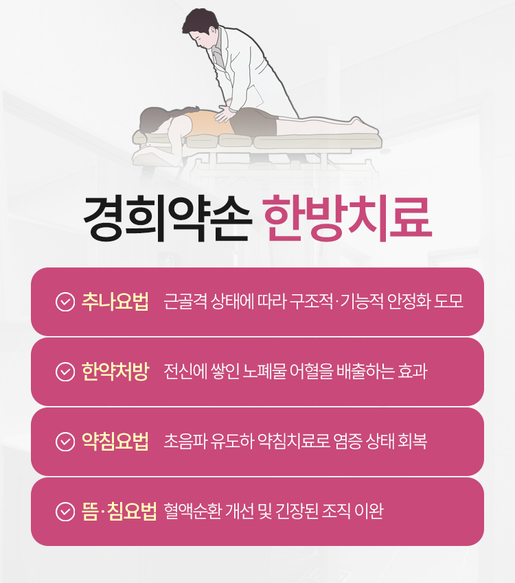 주되게 진행이 되는 치료에는 한약 처방 그리고 추나요법 두 가지를 꼽을 수 있었습니다. 한약 처방은 신체 안에 쌓인 노폐물 어혈을 풀어 주는 치료로, 어혈이 풀어지기만 해도 혈류의 흐름을 건강하게 바로잡는 역할을 기대해 보실 수 있을 것이라고 안내를 드렸습니다. 또한 추나요법은 근골격 문제가 발생했을 때 진행되는 치료라고 생각해 주시면 되겠는데 이 과정 속에서 자연스럽게 구조적 문제와 기능적 문제를 차차 회복할 수 있을 것이라는 점도 안내했습니다. 이렇듯, 개개인의 상태에 따라 각기 다른 치료가 이루어지고 있으며 필요에 따라서는 이외에도 약침요법 등 여러 가지 치료를 추가로 병행하여 회복을 도와드리고 있으니 참고해 주시기를 바랍니다.