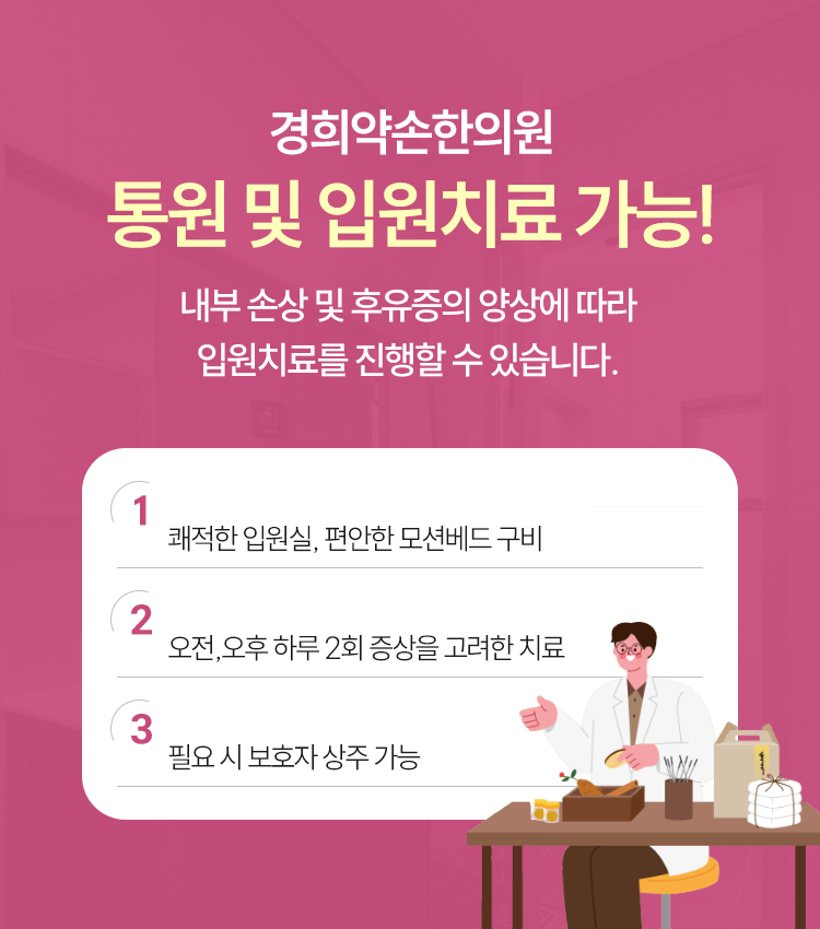 도로 위의 상황은 언제나 유동적이며 본인이 아무리 주의를 기울인다고 해도 사고에 휘말릴 수 있음을 기억해 주셔야 합니다. 남악야간진료한의원에서는 저녁 시간대 갑작스럽게 추돌을 겪으셨을 때나 다른 일정을 마친 후 몸을 살피고자 하실 때 내원을 진행하실 수 있는데요. 이상이 확인된다면 통원치료 또는 운영 중인 입원실의 도움으로 입원치료도 받아 보실 수 있다고 안내드립니다.
