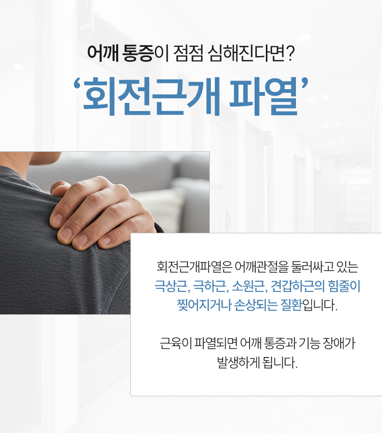 많은 분들이 어깨가 아프면 먼저 익숙한 오십견을 의심하고는 하시는데요. 오십견은 관절낭 염증이 생기는 질환이고 회전근개 파열은 힘줄이 찢어지는 등 문제가 생긴 상태이기 때문에 내부적 손상의 양상부터가 다른 질환입니다. 그런 만큼 접근 방식 등에도 차이가 존재할 수밖에 없는 부분이라 이들을 구분 후 관리해 주는 게 현명하다고 보시면 되겠습니다. 목포어깨통증한의원에서도 문제 상태를 구체적으로 파악 후 회복에 보탬이 되어 드리겠습니다.