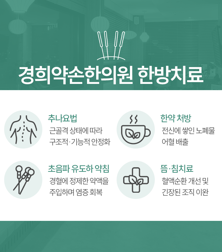 또한 어혈의 경우에는 미세 혈관 손상으로 인해 발생하게 되는 응고된 혈액인데요. 일종의 노폐물로 분류가 되며 혈액순환을 방해하는 요소가 되는 존재이기 때문에 이에 대해서는 한약 처방, 약침요법 등으로 다스릴 수 있습니다. 이렇듯 남악주말진료한의원은 겪고 계신 바를 고려한 관리로 건강한 회복에 초점을 맞춥니다.
