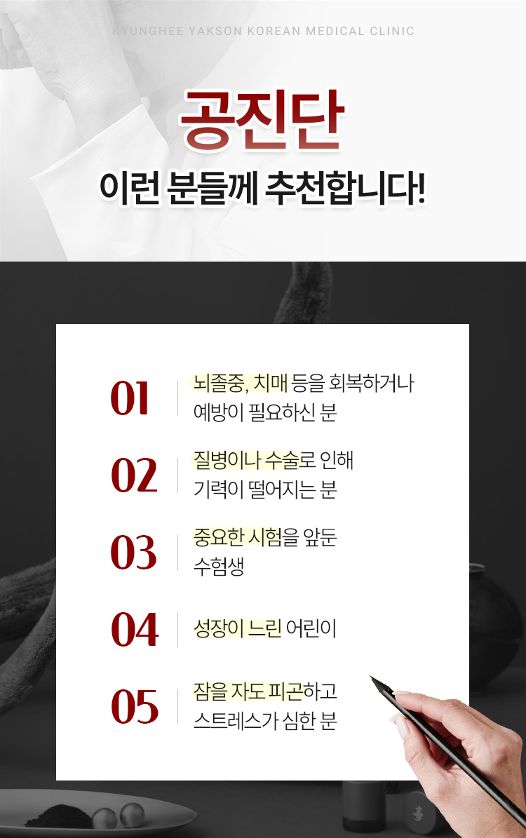특히 최근 들어 무언가를 자꾸 깜빡깜빡 잊는 일이 늘어났고, 전반적인 인지 능력이 저하되었다 생각되는 분들이 계셨을 것입니다. 치매에 대한 걱정도 들고 기억력 자체가 저하되다보니 생활이 불편해졌다는 생각도 드셨을 텐데 이런 떄에도 마찬가지로 공진단을 복용하여 치매 예방과 기억력 개선 효과를 기대해 보시면 되겠습니다.