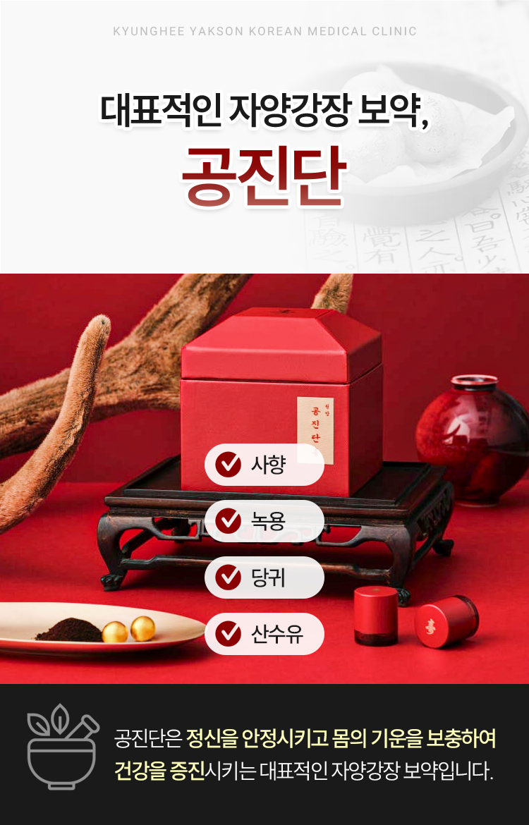 신체의 기력을 보강하는 여러 방법 중에서도 공진단은 정신을 안정시키고 몸의 기운을 깊숙한 곳부터 보충해 주는 방식으로 건강을 증진시켜 주는 보약의 일종이라고 이야기합니다.