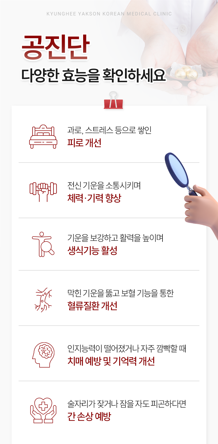 공진단은 그 쓰임새가 넓고 그만큼 다양한 효능을 지니고 있다고 말씀을 드렸습니다. 현대인들은 과도한 업무와 만성적인 스트레스에 상시 노출되어 있는데 이러한 요인들로 인해 겹겹이 쌓였던 피로감을 개선하는 데 공진단을 활용하실 수 있습니다. 기력이 소진되어 아침에 눈을 뜨는 것마저 괴로우셨던 상황이라면 체력과 기력을 향상시키는 과정을 통해 일상의 활기를 다시 거머쥐실 수 있겠습니다. 또한 단순히 신체적인 피로를 풀어 주는 데에 그치지 않고 생식 기능의 활성화처럼 그외 다른 요소들에도 도움을 주고 있습니다.