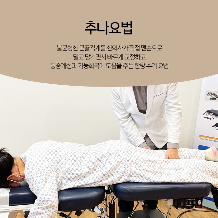 추나요법은 환자에게 따로 약물을 투여하거나 마취, 피부절개 같은 수술적인 방법을 적용하지 않고 오로지 수기로만 진행하는 교정치료입니다. 그래서 무릎관절염에 적용한다면 비침습적으로 무릎에 가해지는 압박을 해소할 수 있고, 관절염이 더 진행되는 것을 최대한 늦추는 효과를 기대할 수 있습니다. 저희 한의원에서는 환자에게 필요시, 추나요법과 함께 침과 약침으로 염증을 줄여주고 한약을 처방하여 손상된 관절과 연골을 강화해서 신체의 자체적인 회복력을 높여드리고 있으니 참고해 주시기 바랍니다.