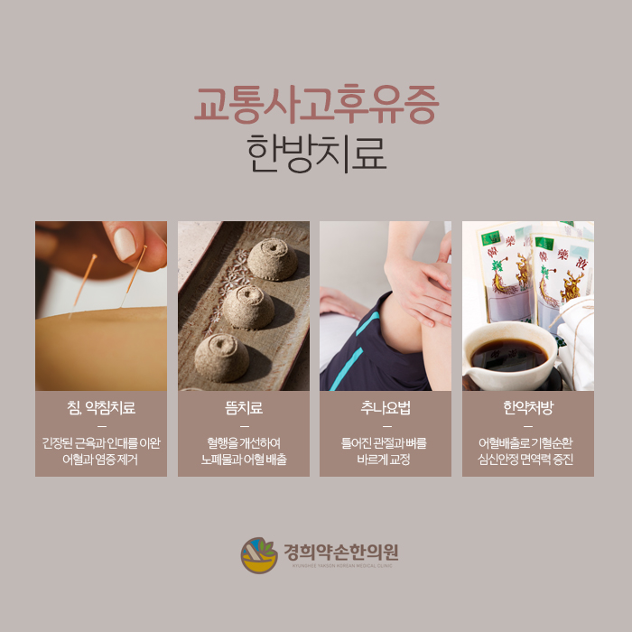 특히 목이 앞뒤로 크게 젖혀지면서 경추의 배열이 틀어지고 주변 근육과 인대가 긴장하거나 손상되기 쉬운데, 이 때문에 목통증과 뒷목뻐근함, 어깨결림을 후유증으로 호소하는 환자가 많은 편입니다. 교통사고후유증은 근골격계 증상 외에도 구토와 메스꺼움, 소화불량, 식욕부진, 두통, 이명, 어지럼증이 함께 나타나기도 합니다. 그리고 사고가 났던 당시의 상황이 트라우마로 남아서 가슴두근거림과 우울감, 불안함, 수면장애, 집중력저하 등 심리적인 증상을 호소하는 환자도 적지 않아요. 만약 교통사고의 충격으로 체내 미세한 출혈이 일어나서 어혈이 생성되었다면 기혈순환이 저하되어서 컨디션과 면역력이 저하되고 원인을 찾기 힘든 통증이 오래 이어질 수도 있으니 빠른 배출이 필요하겠습니다.