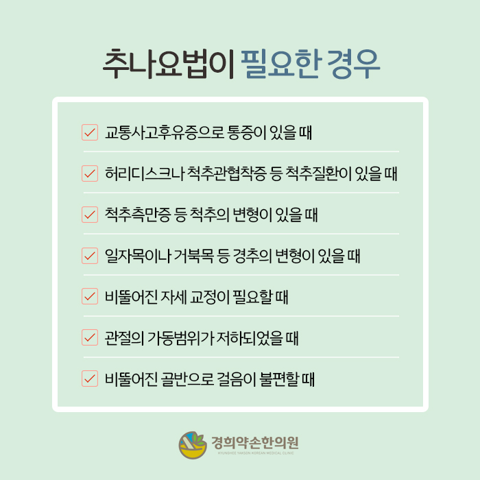 추나요법은 관련 교육을 받은 한의사만이 실시할 수 있는 한방 수기 교정치료입니다. 목포한의원 원장님께서 직접 맨손과 전용테이블만을 사용해서 실시하므로 환자 한 분 한 분의 상황에 맞게 추나기술이나 강도를 적절히 조절해서 적용할 수 있다는 장점이 있습니다. 추나요법에서 추나란 밀고 당긴다는 뜻을 가지고 있는데요. 실제로 문제가 생긴 근골격계 부위를 맨손으로 밀거나 잡아당기면서 유효한 자극을 가하고 원래의 균형상태를 회복해줍니다. 이는 어긋나고 틀어진 관절과 뼈를 강제로 맞춘다는 것이 아니라, 조금씩 자극을 가해서 나아지는 방향으로 진행하는 것이라서 부작용이나 후유증에 대한 걱정을 덜 수 있습니다. 특히 목포한의원 추나요법은 약물투여나 수술적인 방법을 적용하지 않고 오로지 맨손으로만 하여 남녀노소 누구나 편하게 선택할 수 있으니 참고해 주시기 바랍니다.