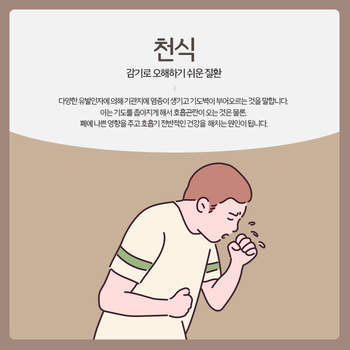 천식을 처음 겪는 분들의 경우 증상이 감기와 비슷하여 이 둘을 혼동하시기도 해요. 그래서 증상을 가볍게 여기고 천식의 초기 치료 시기를 놓치기도 합니다. 천식이 위험한 이유는 바로 환자의 많은 비중을 차지하는 연령대가 아이들과 노인이라는 점입니다. 아이들과 노인의 경우 면역체계가 약하기 때문에 가벼운 질환에도 신체기능이 저하되고 다른 합병증으로 넘어가기 쉽습니다. 특히 아이들의 경우 신체 성장이 아직 완성되지 않은 상태이기 때문에 천식에 노출될 경우 증상이 만성화되거나 전반적인 기능이 떨어지는 원인이 될 수 있어요. 그래서 아이때 천식에 걸리면 성인이 되어서까지 치료가 힘들어지는 이유이기도 합니다.