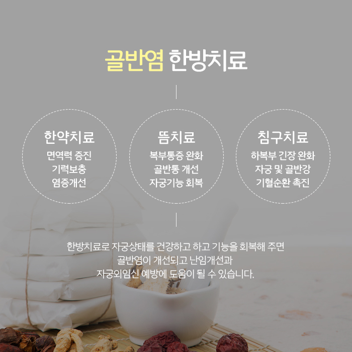 저희 한의원에 내원하시면 원장님께서 1:1 진료를 실시하여 환자의 증상과 체질, 평소 건강상태 등을 면밀하게 살피고 골반염이 발생한 원인을 찾아 개개인에게 맞는 체계적인 한방치료를 처방해 드립니다. 영암 삼호 골반염한의원은 골반염을 개선하기 위해 자궁의 면역력을 높이고 체내 염증을 줄이는 것을 목표로 한방치료를 진행합니다. 한방치료로는 한약과 침, 약침, 뜸, 부항, 온열치료, 추나요법 등을 준비해 두었습니다. 우선 한약은 환자 개개인의 체질에 맞게 조제하여 복용하도록 하는데요. 한약은 자궁내 어혈과 노폐물을 풀어주고 신진대사를 원활하게 하여 염증을 개선하고 손상된 조직을 재생하는데 도움이 됩니다.