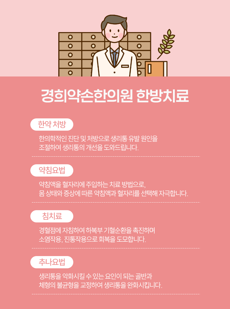 발생하게 되는 문제의 원인이 다양한 만큼, 치료도 일괄적으로 진행되지 않고 한 사람, 한 사람의 상태를 따진 후에 이루어지고 있습니다. 생리통 문제가 발생하며 건강한 생활에 방해를 받고 있었던 상황이라면 늦지 않게 도움을 받아 보시기를 바라도록 하겠습니다. 며칠만 참으면 되는 일이라고 가볍게 생각하실 수 있겠으나 그것이 심한 스트레스를 유발하여 아픔을 더 키울 수 있고, 때로는 다양한 질환과 직접적으로 연관되어 있을 가능성도 존재합니다. 이런 지점들을 고려하시면서 관리에 들어가 주실 것을 권유드리도록 하겠습니다. 감사합니다.