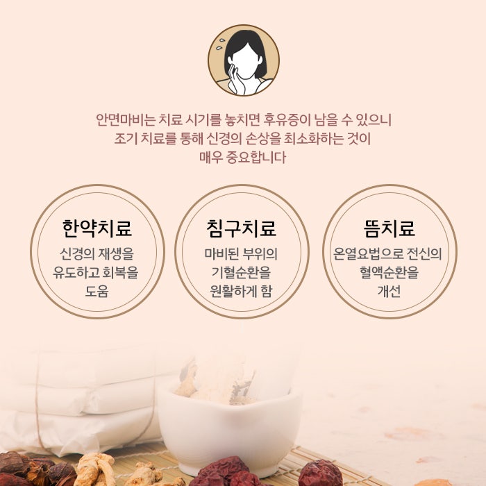 저희 한의원은 목포안면마비 회복을 돕고 후유증이 남지 않도록 하기 위해 침과 약침, 뜸, 부항, 한약 등 한방치료를 환자 체질에 맞게 처방해 드립니다. 침치료는 안면신경 주변의 혈류를 원활하게 하고 긴장을 풀어줍니다. 약침은 소염, 진통작용을 하고 뜸은 체온을 높여서 면역력을 증진하는데 도움을 줍니다. 한약은 기혈순환을 원활하게하고 손상된 조직과 신경을 재생하는 효과가 있습니다. 안면마비는 초기에 얼마나 신속하게 알아내서 관리하느냐에 따라 회복기간과 효과적이 면에서 달라질 수 있다는 것을 잊지마세요.