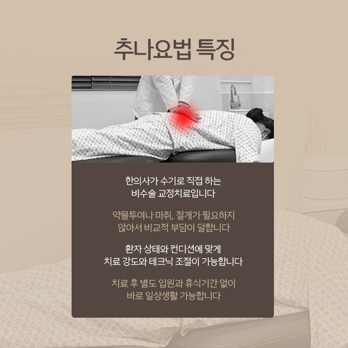 목포한방병원 추나요법은 근골격계 부위의 기혈순환을 원활하게 해줘서 허리통증이나 척추질환이 더 악화되는 것을 예방하는데도 도움을 줍니다. 추나요법은 환자의 몸에 약물을 투여하거나 마취, 피부절개 같은 수술적인 방법을 전혀 적용하지 않고 오로지 한의사가 맨손으로만 하는 수기 교정치료라서, 남녀노소 누구나 근골격계 증상이 있을 때 수술적인 치료에 대한 부담이나 부작용에 대한 걱정을 덜고 편하게 받을 수 있습니다. 목포한방병원은 원장님께서 꼼꼼한 진료 하에 환자의 상태에 따라 추나요법의 유형과 강도, 테크닉을 조절해 드리고 있으니 만족스러운 효과를 기대할 수 있습니다.
